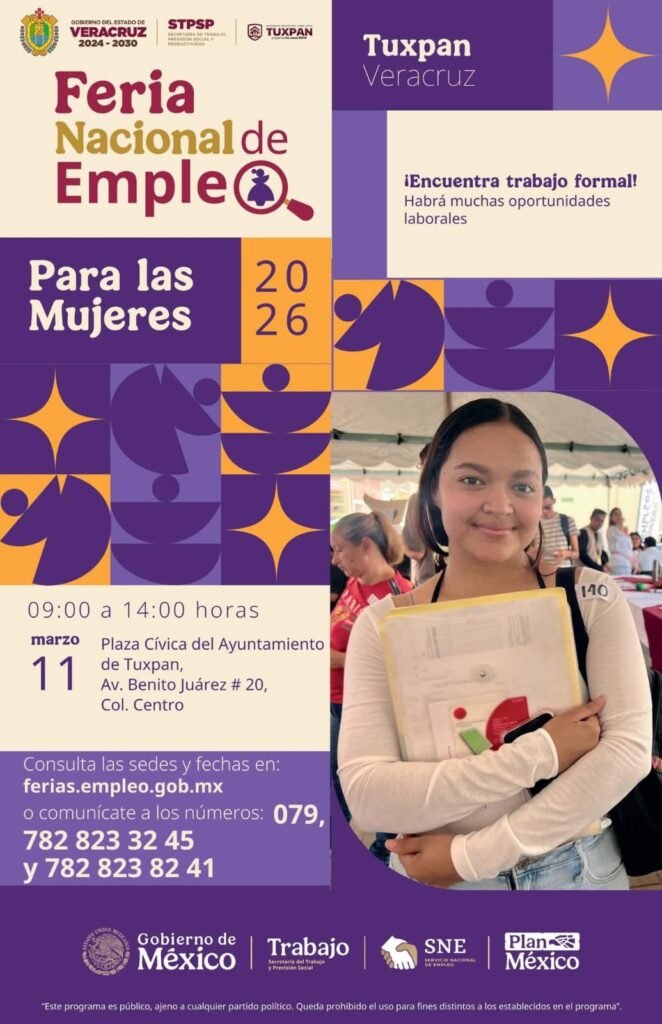El próximo miércoles 11 de marzo se llevará a cabo la Feria Nacional de Empleo en la Plaza Cívica del Ayuntamiento de Tuxpan, evento que busca acercar oportunidades laborales a la población del municipio y la región.